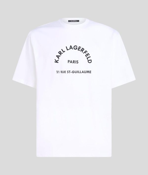 Step up your casual style with this relaxed-fit T-shirt, designed for effortless wear with a bold statement. Featuring a ribbed crew neck and roomy short sleeves, this tee is topped with standout Rue St-Guillaume print at the chest. Pair it with denim or joggers for laidback, street-ready looks.