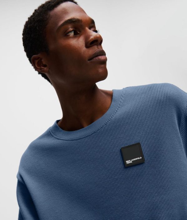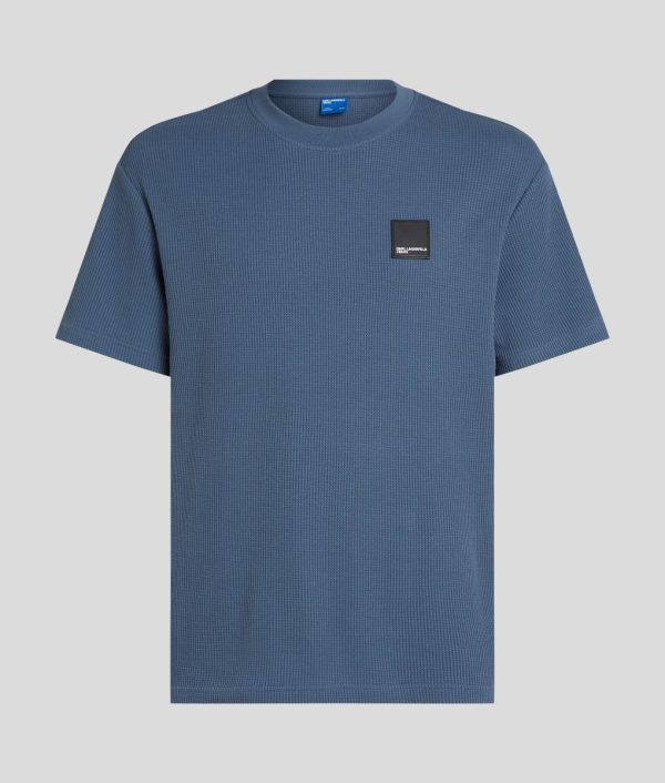 Channel effortless style with this statement waffle-textured t-shirt. Featuring a classic ribbed crew neck and short sleeves, anchored by a contrasting KARL LAGERFELD JEANS logo.