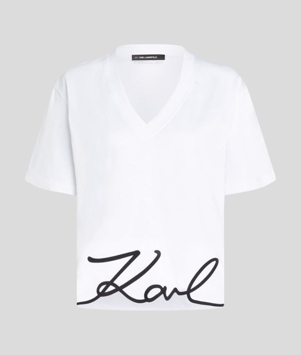 A chic addition to any wardrobe, this slightly cropped T-shirt features a V-neckline and a relaxed boxy fit. KARL Signature embroidery adds a touch of flair, perfect for effortless styling.