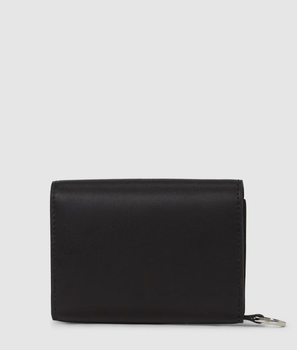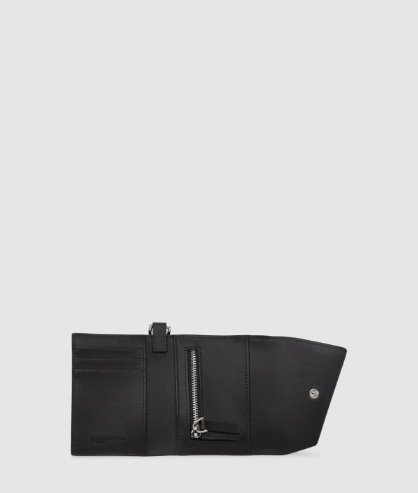 This sleek cardholder features a pocket-friendly silhouette with edgy geometric detailing. Multiple card slots and a zipped coin purse keep essentials organized, while a detachable wrist strap offers versatile wear.