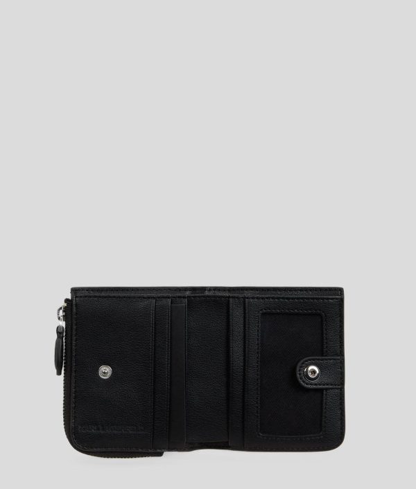 This petite yet practical wallet showcases a bifold design with a secure button closure. A zipped compartment and multiple card slots offer effortless organization, while an embossed Ikon monogram design adds a distinctive flair. A subtle KARL LAGERFELD logo completes the chic accessory.