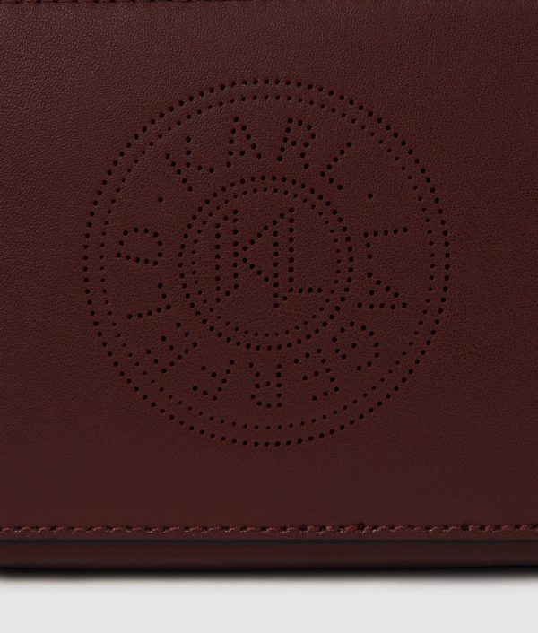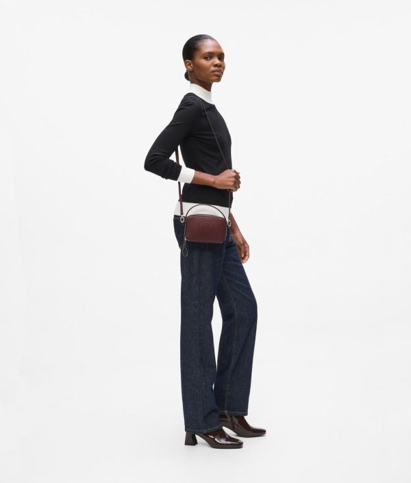 A leather camera bag with a structured top handle and perforated Circle artwork. Spacious interior with card slots offers practicality for everyday use.