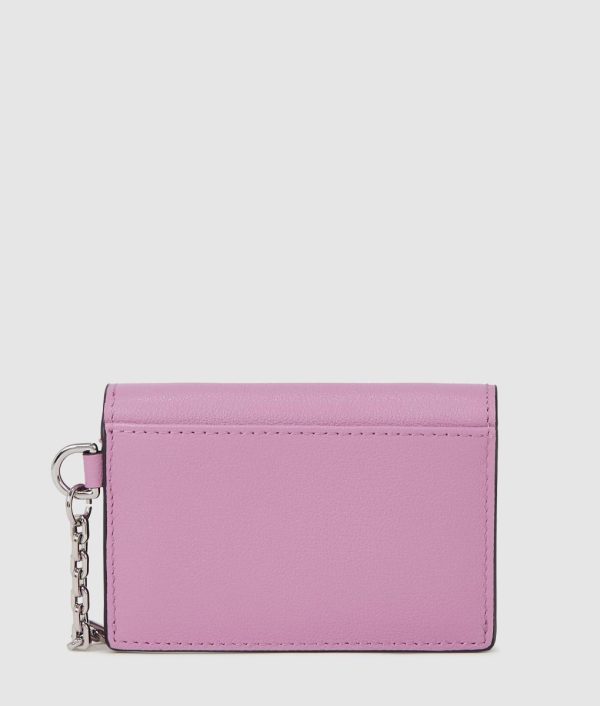 A sleek leather cardholder with bold Signature hardware and a chain clip, designed for essential organization.