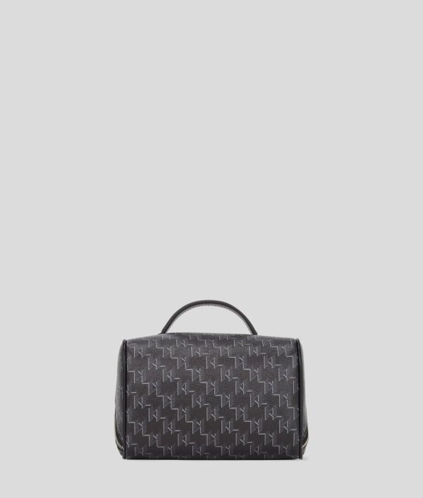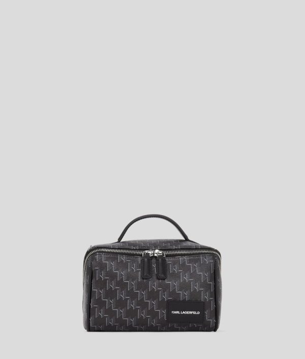 Elevate your travel essentials with this statement wash bag adorned in an all-over Karl Monogram design. Featuring a secure two-way zip closure and a convenient top grab handle, this versatile accessory merges function with fashion.