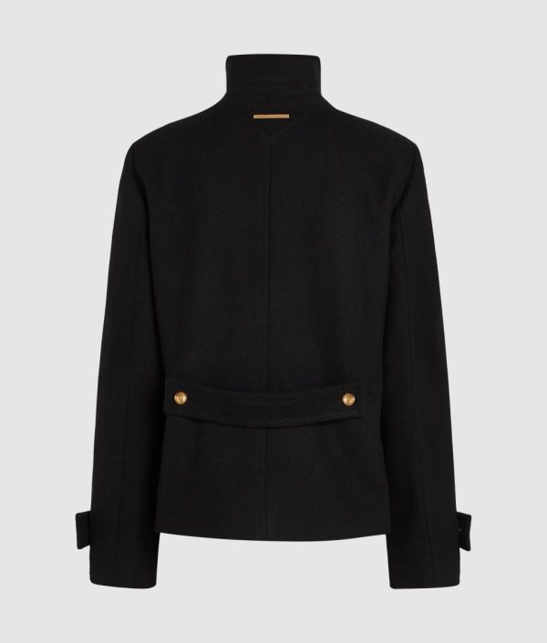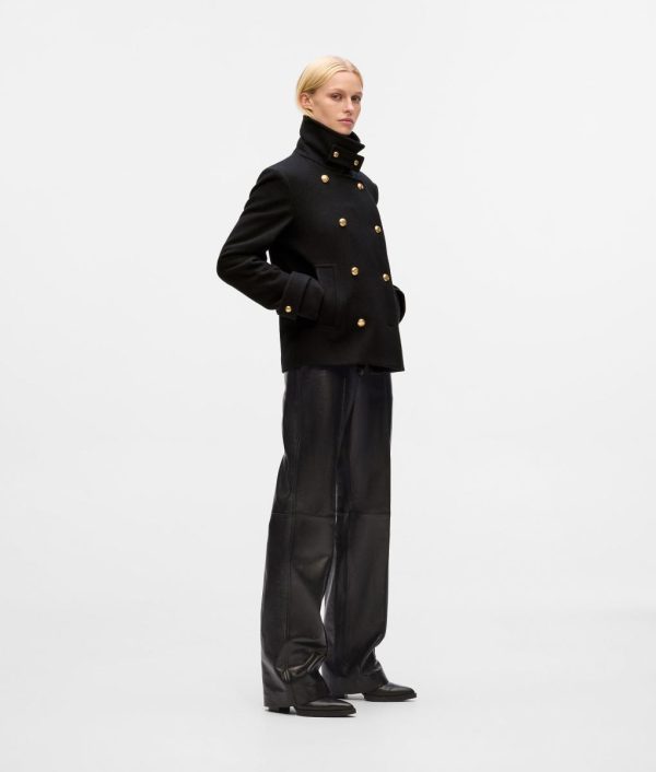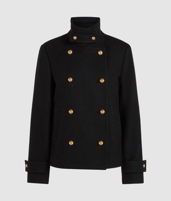 Elevate your outerwear collection with this sophisticated wool-blend coat featuring a timeless double-breasted design, enhanced by elegant gold-button accents and refined tab detailing for a polished finish.
