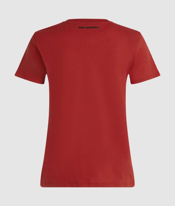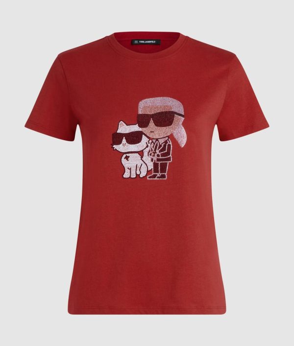 Elevate your casual style with this eye-catching T-shirt featuring a dazzling rhinestone-embellished design showcasing the iconic IKON Karl and his beloved Choupette at the chest.