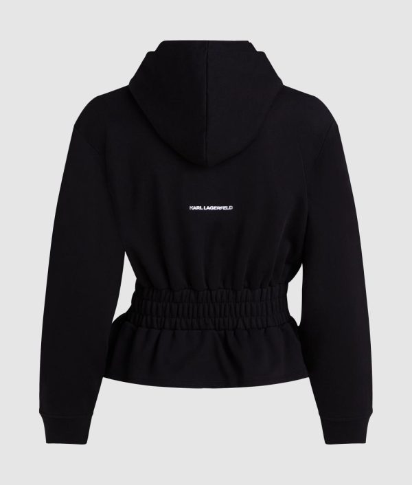 This premium hoodie features a dramatically cinched waist that creates a striking contemporary silhouette, ideal for sophisticated streetwear looks.